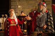 ”...I Malatesta di Rimini, Castiglione Aretino, Isola Maggiore, gli affittuari del Trasimeno mandarono doni. In città i rettori delle arti, nel contado i sindaci delle ville, tutte le famiglie del comune anche modeste, offrirono dolci, pollami, uccelli, strami pei cavalli. Fra i doni furono ammirati uno scheggiale di perle del costo di fiorini 100 donato da Castello, una pezza di velluto vermiglio presentata da Firenze, un cavallo e due pezze di drappo intessuto a seta e d'oro mandato da Malatesta Malatesti, ed un gioiello da petto valutato fiorini 200 offerto da Carlo Malatesti. Per addobbare il Palazzo Casali poco alla volta spogliato dai cortigiani, i cittadini prestarono letti, tavole, biancherie, bacili, posate e simili masserizie. Nei giorni delle feste riuscite molto splendide, si successero gli armeggiamenti ed i balli”... .